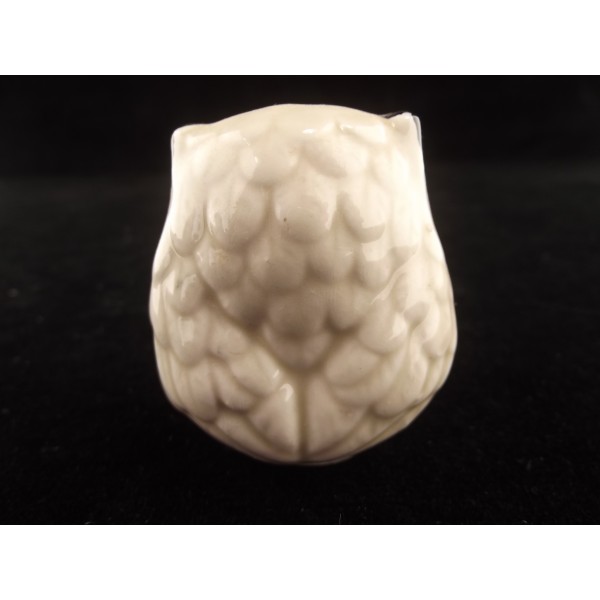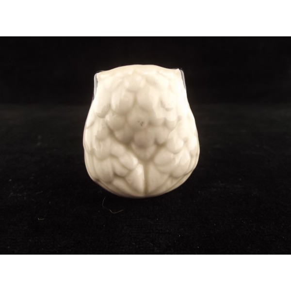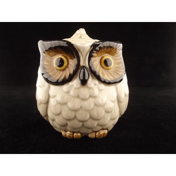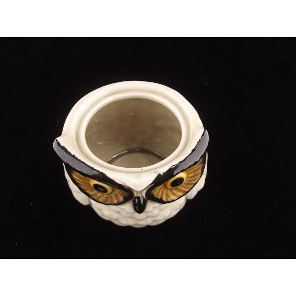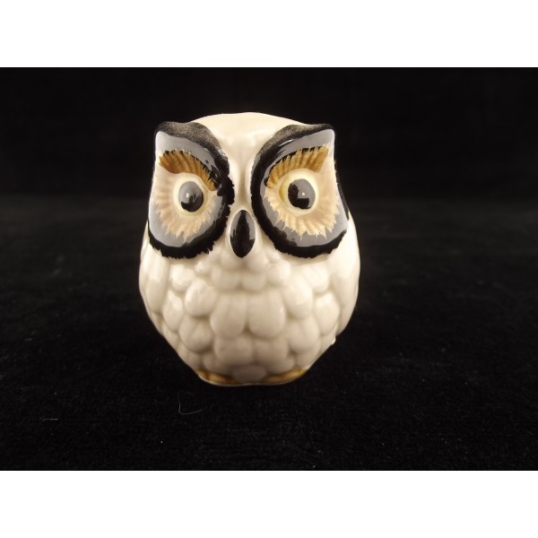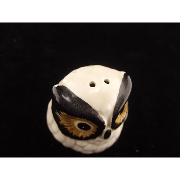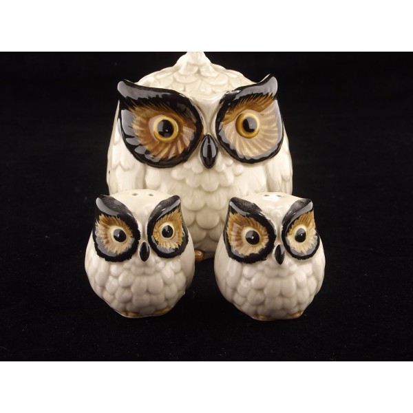 Ensemble comprenant une salière, une poivrière et un pot à moutarde en faïence barbotine représentant des chouettes.