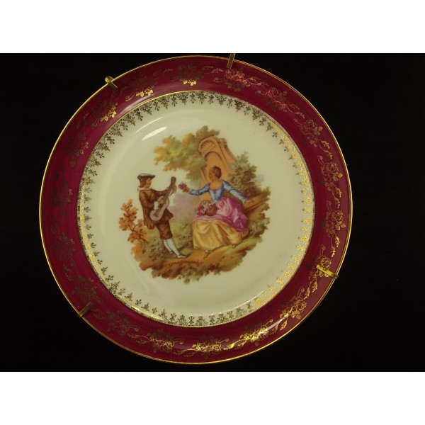Assiette en porcelaine de Limoges, marquée Limoges France décor dorure sur le bord , bordure rouge, décor central reproduction d'un tableau de Fragonard représentant une scène galante, vendue avec son support d'assiette.