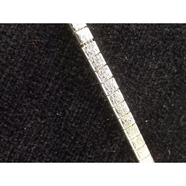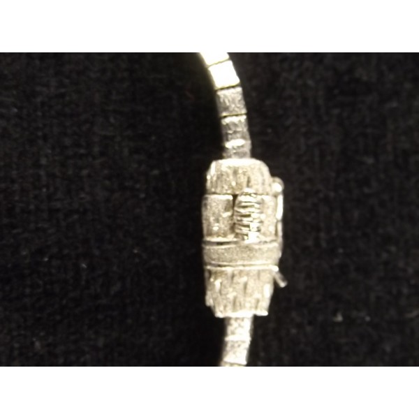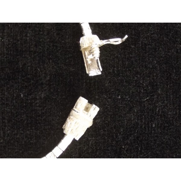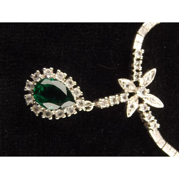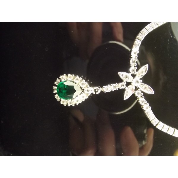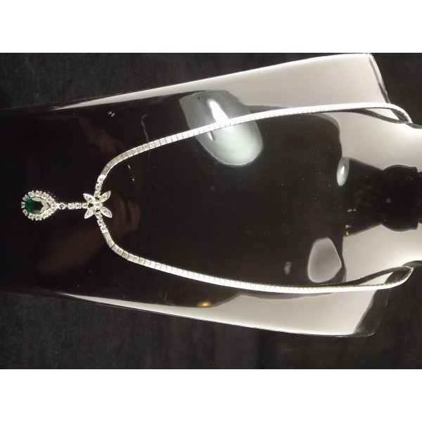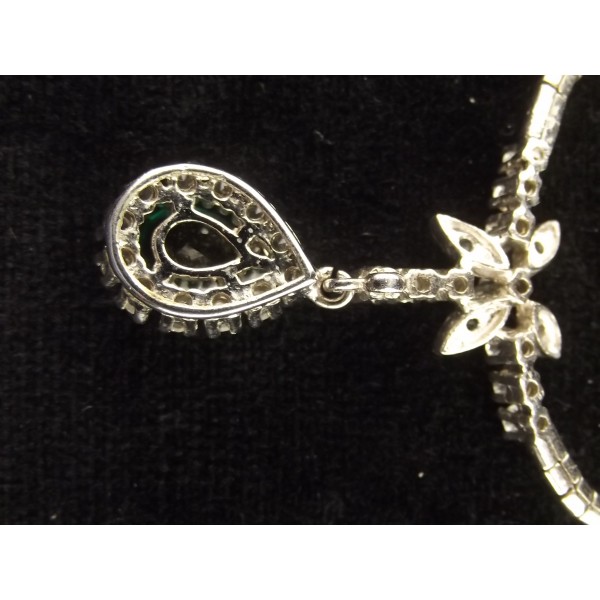 Très beau Collier ancien, fin XIXème, en argent (poinçons charençon et 800), façon rivière de diamant, copie de pièce de joaillerie, orné d'une pierre du Rhin verte (cristal) et de pierres blanches d'imitation, fermoir à cliquet avec goupille de sécurité, maille articulée semi-rigide.