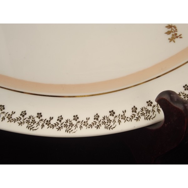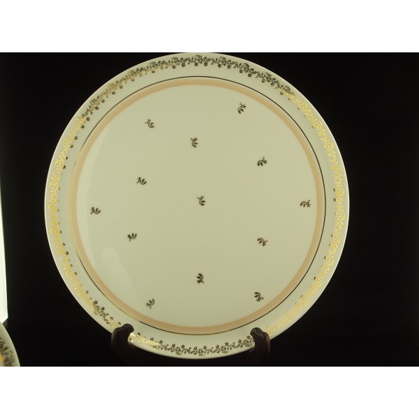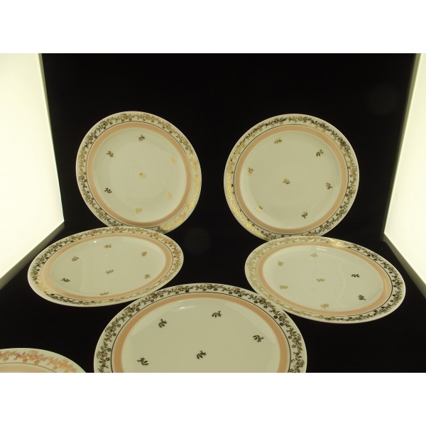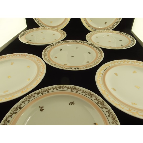 Service à dessert en porcelaine de Limoges 9 pièces, composé d'un plat à gâteau/tarte et de 8 assiettes, estampillé veritable porcelaine émaux Limoges, Limoges France, décor bordure feuillage doré, repris en petits motifs dans l'assiette/le plat, filet (largeur 1 cm) rose.