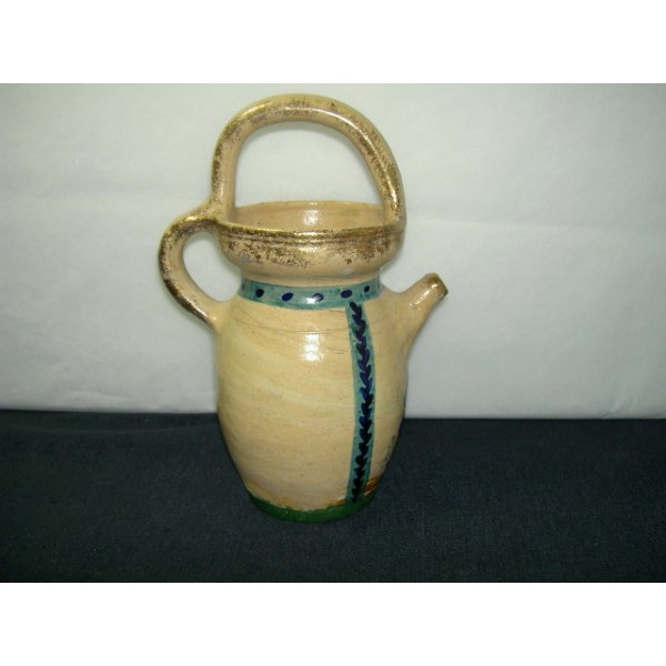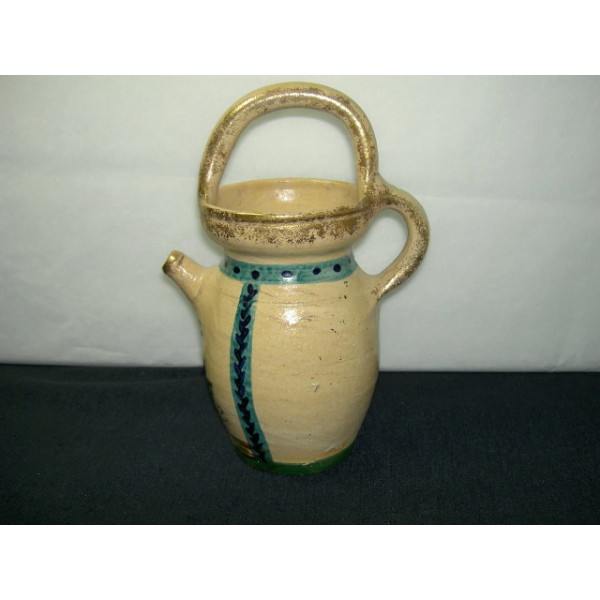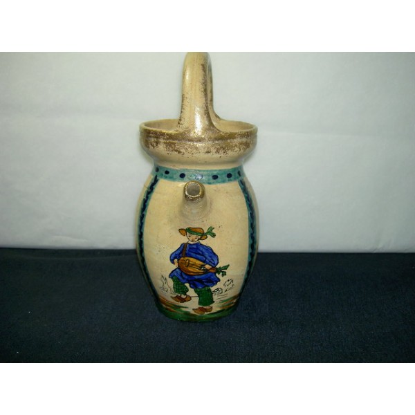 Cruche en grès une anse et une poignée à décor de personnage breton.