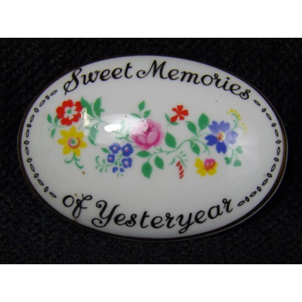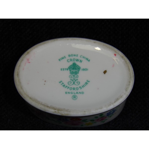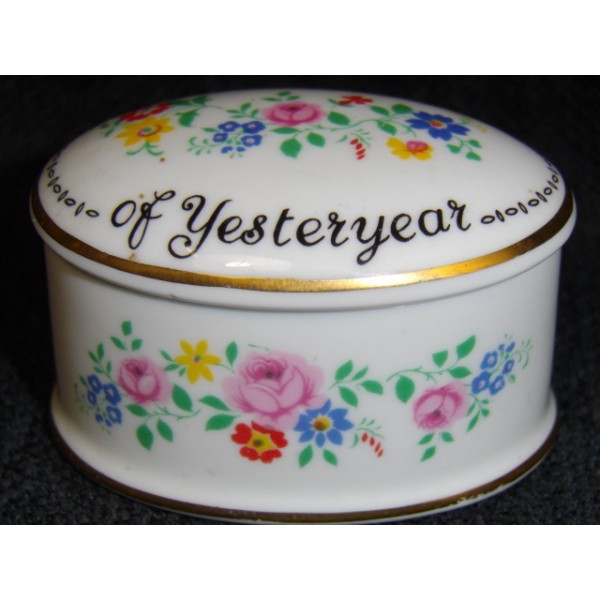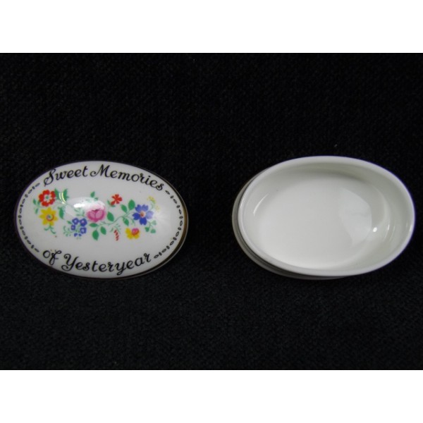 Petite boîte en porcelaine au couvercle à décor floral avec la mention sweet memories of yesteryear, marquée fine bone china crown staffordshire england