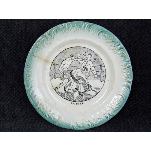 Assiette parlante en faïence thème des sports la Boxe, caricature humorstique, estampillée Faïencerie Nouvelle de Givors.