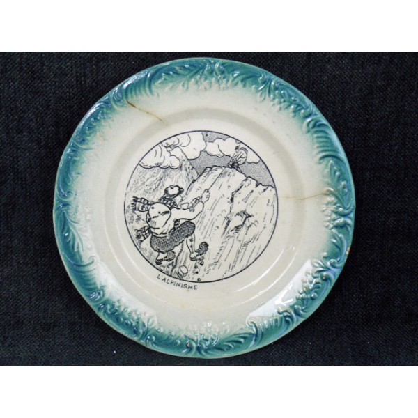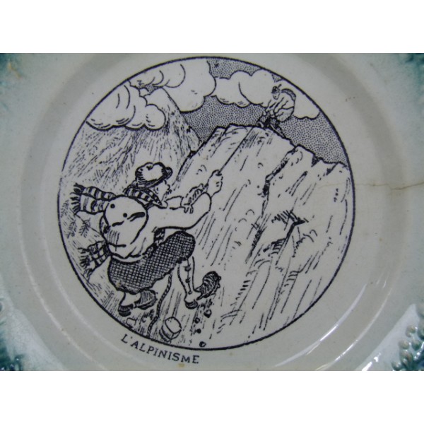 Assiette parlante en faïence thème des sports l'alpinisme, caricature humorstique, estampillée Faïencerie Nouvelle de Givors.