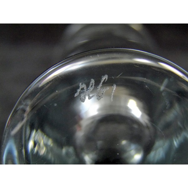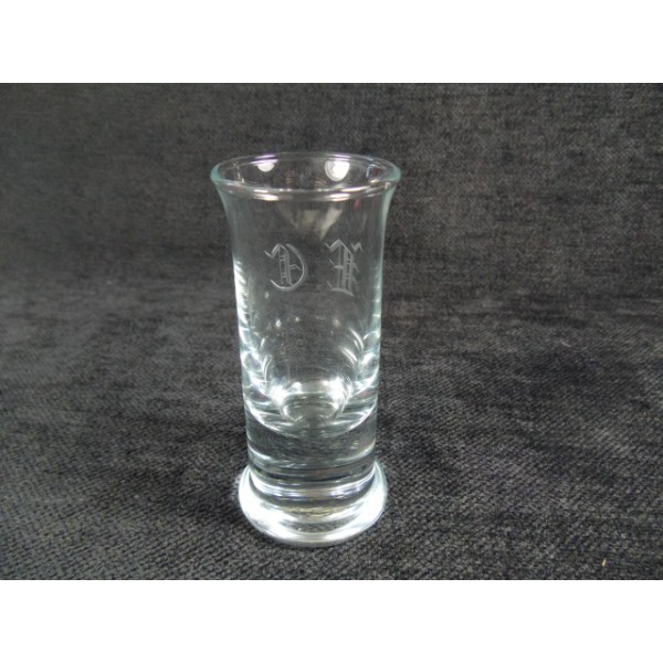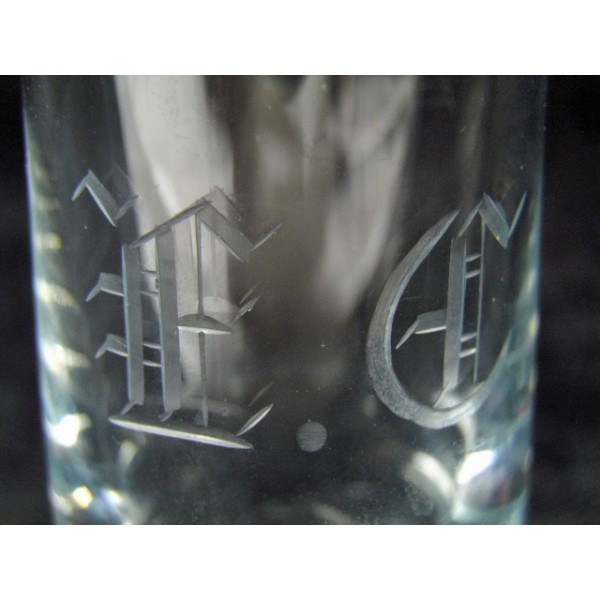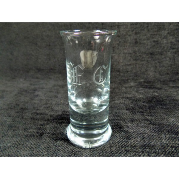 Verre à vodka ancien, en verre, initiales gravées E C, et HG1 en dessous.