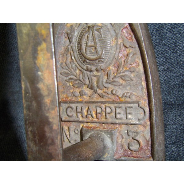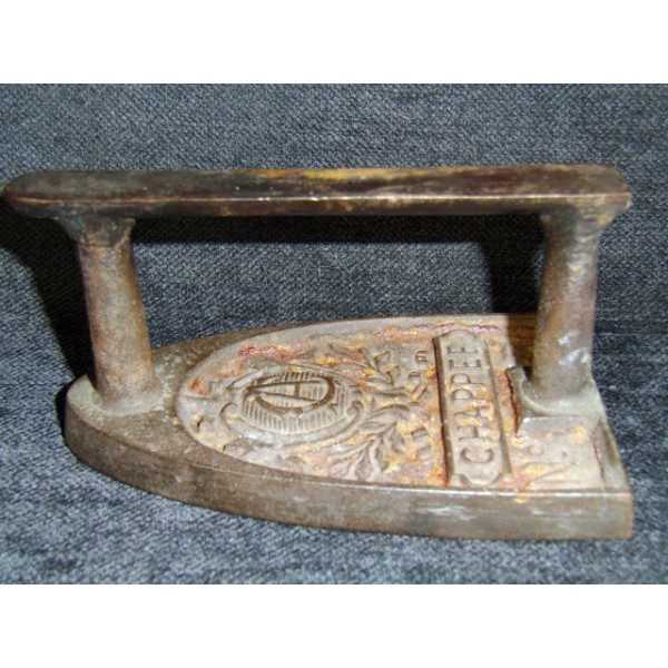 Fer à repasser ancien en fonte de marque Chappée N°3 à décor d'écusson chiffré CA