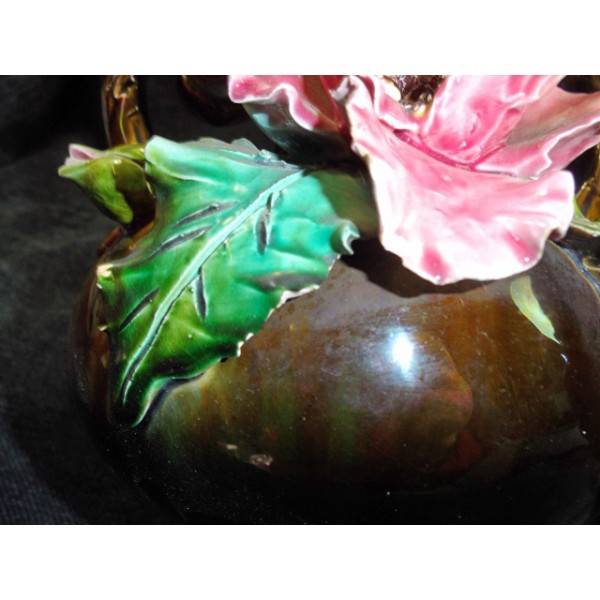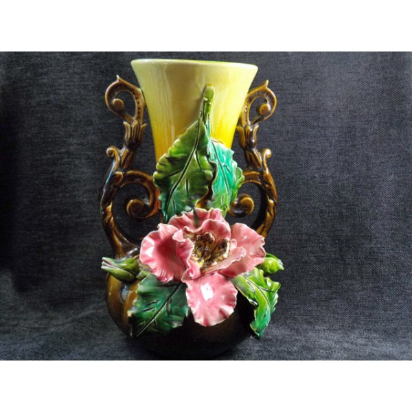 Très beau vase ancien en faïence barbotine, décor de pavot, 2 anses travaillées, travail de la fin du XIXème, numéroté en creux 199