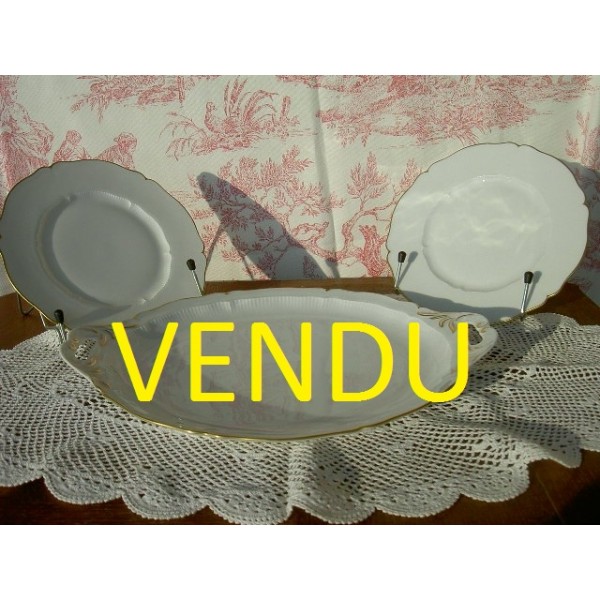 Plat à gateau ou Mignardises ancien en porcelaine de Limoges de la manufacture Haviland. Il est blanc réhaussé d'or sur les reliefs. Recevez en cadeau deux assiettes à dessert du même service!