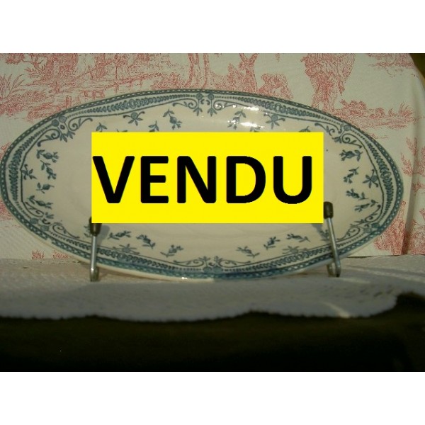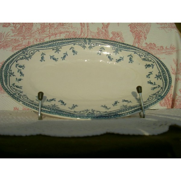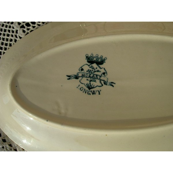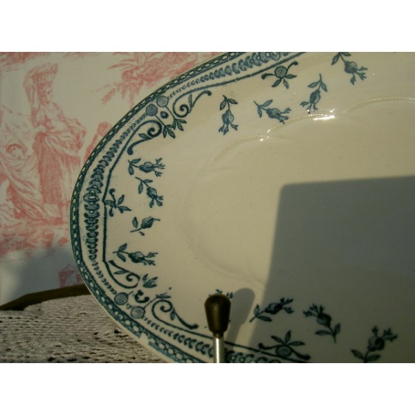 Ravier en faïence de Longwy modèle Mozart décor sous couvert de fleurs et rubans de couleur verte.