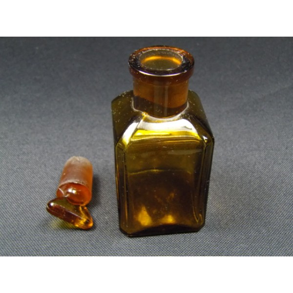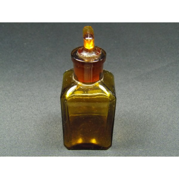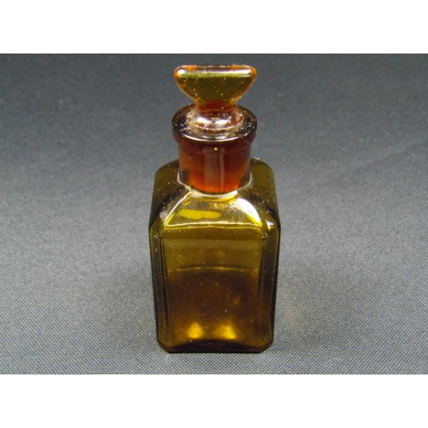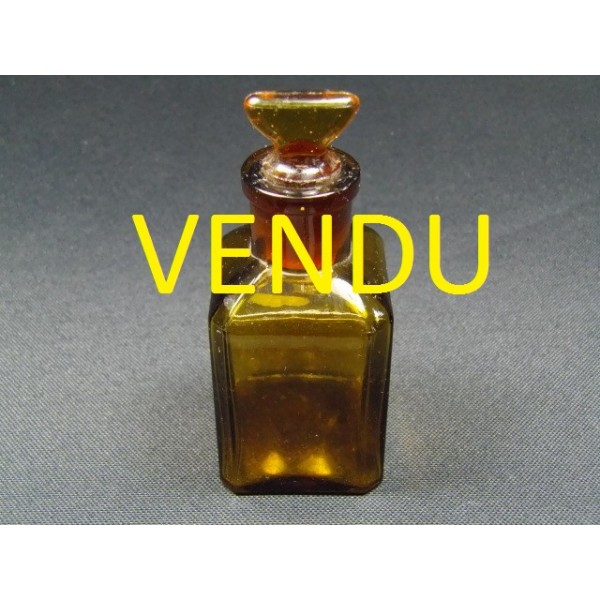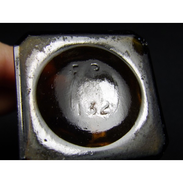 Flacon ancien en verre brun, parfum ou pharmacie, forme carrée, marqué en relief FP 132.