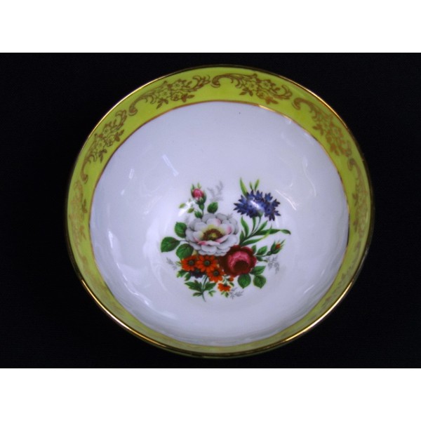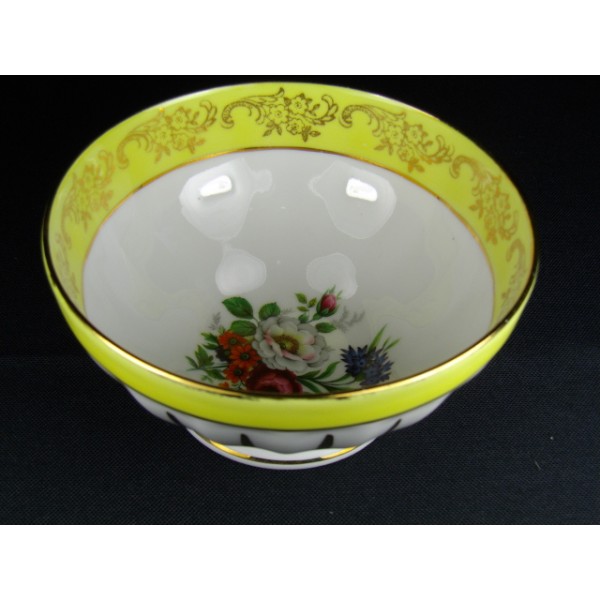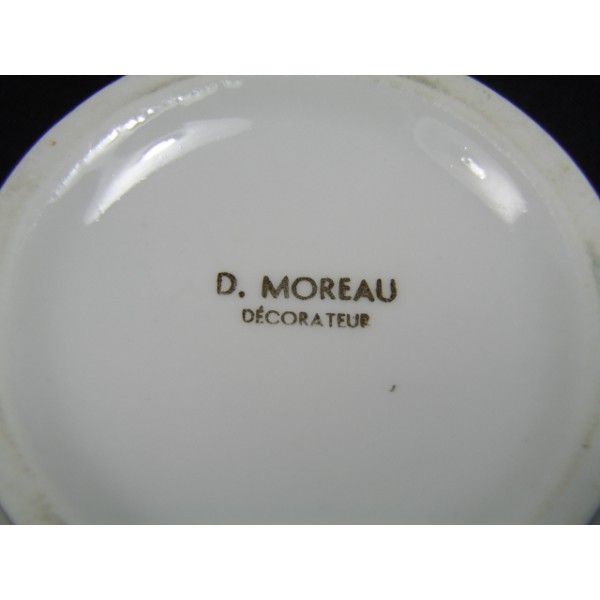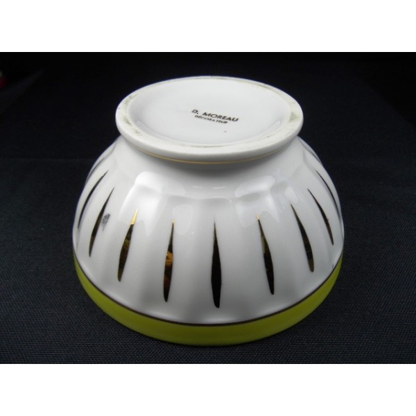 Bol en porcelaine signé D. Moreau décorateur, numéroté en creux, liseret jaune et or, décor floral.
