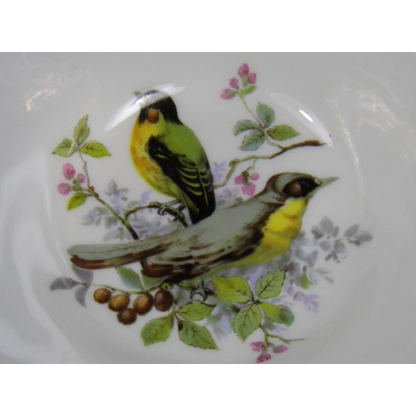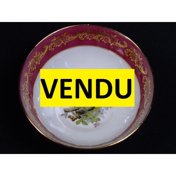Bol en porcelaine signé D. Moreau décorateur, numéroté en creux, liseret rouge et or, décor d'oiseau (couple de mésanges charbonières).
