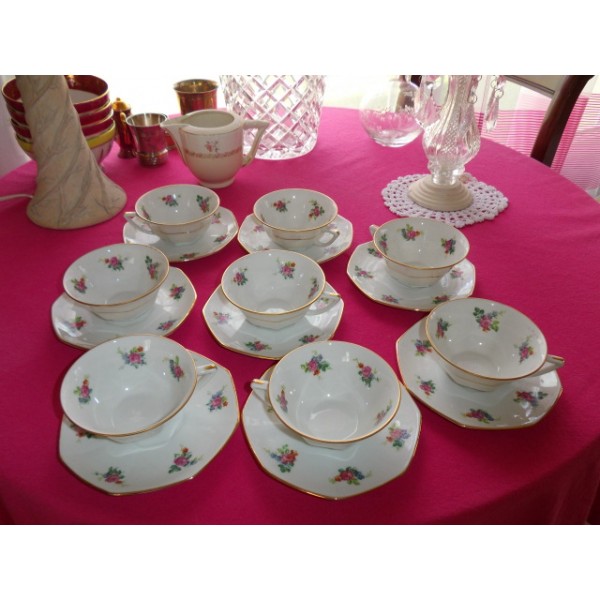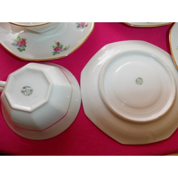 Service de 8 tasses et sous-tasses à café de la maison Legrand à Limoges, circa 1925, décor floral très frais.