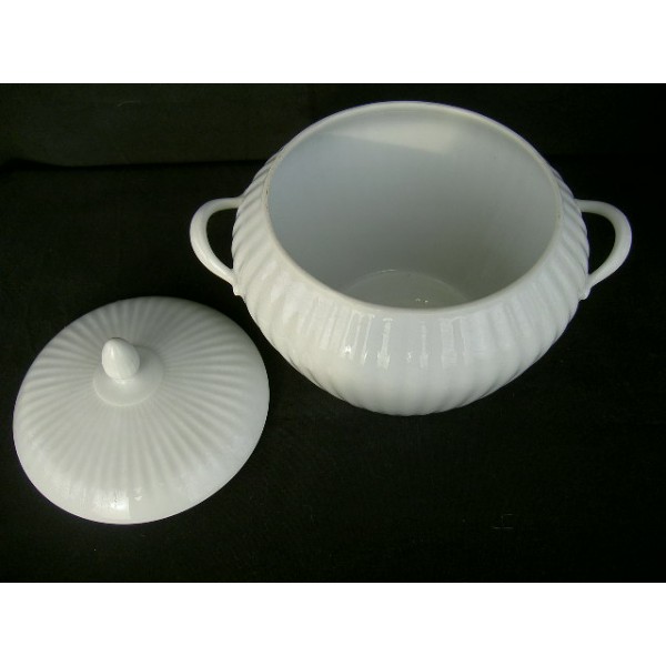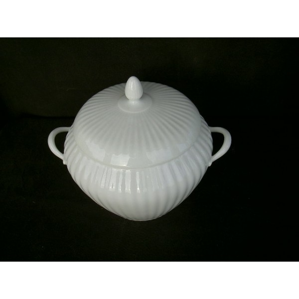 Très jolie soupière en porcelaine blanche , couvercle décor pomme de pin, relief canelé, 2 anses.