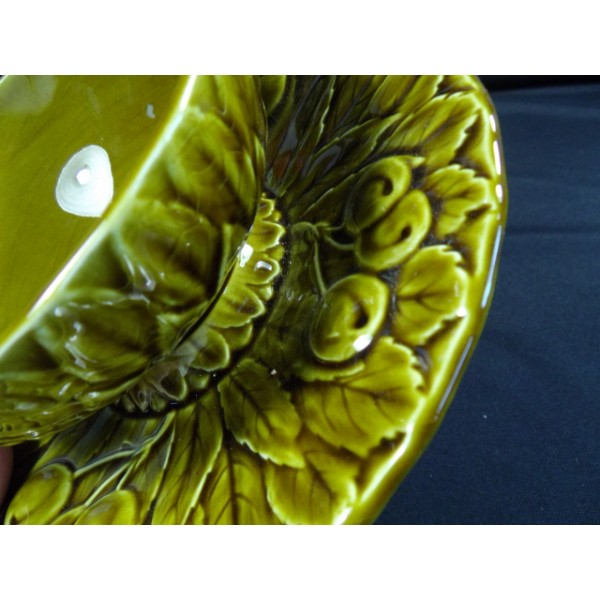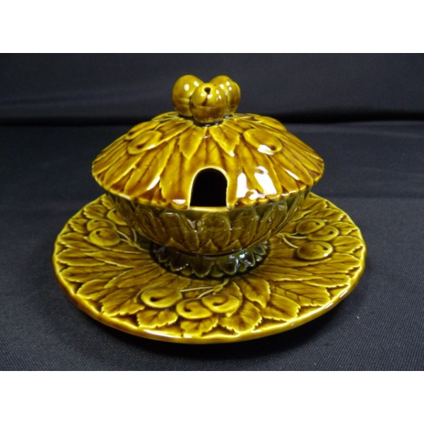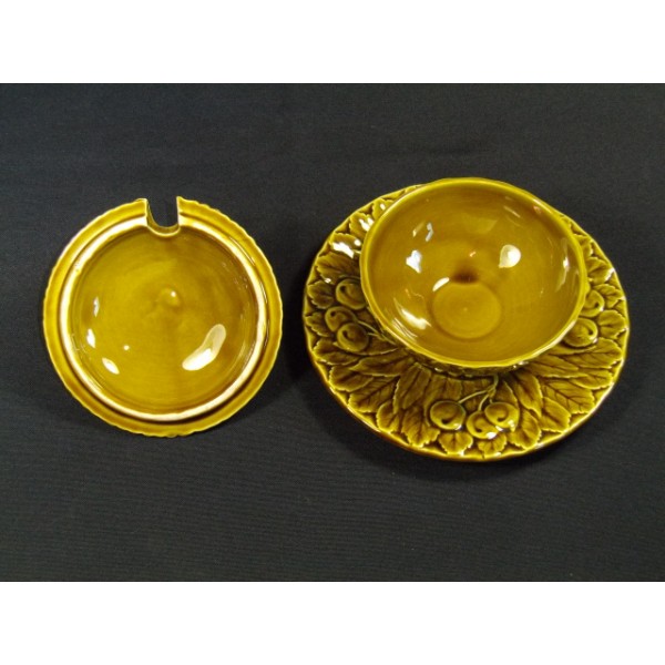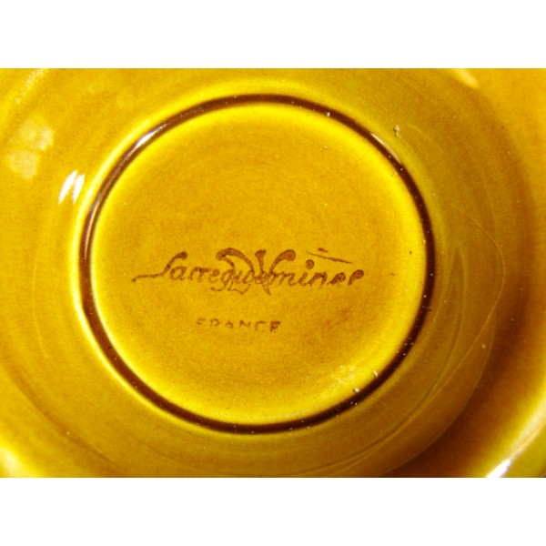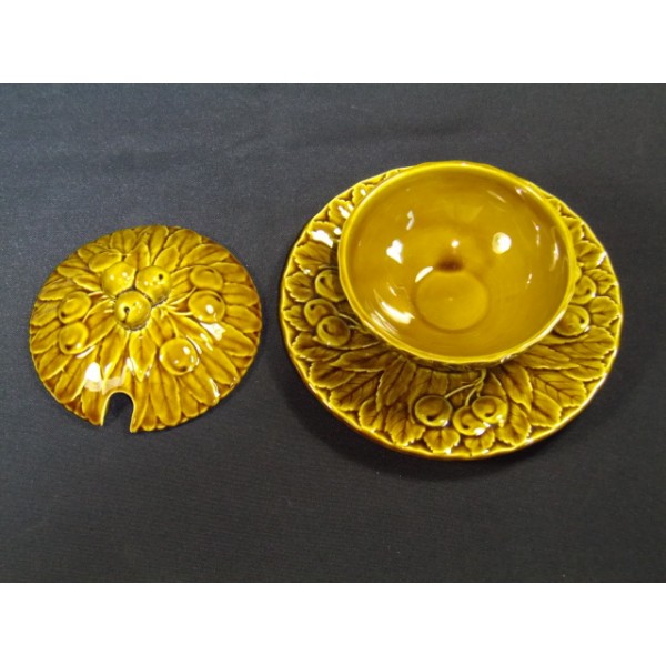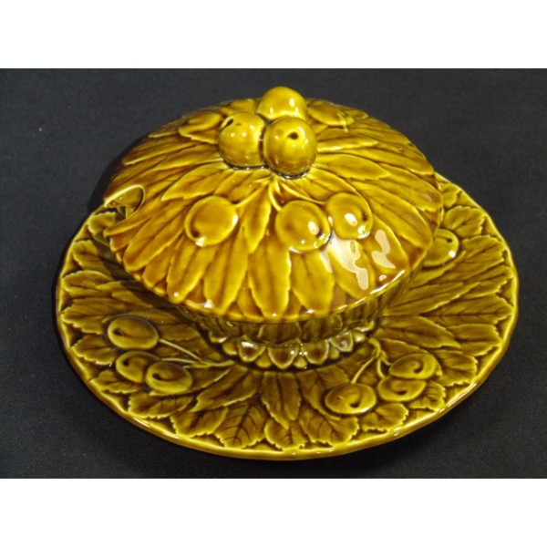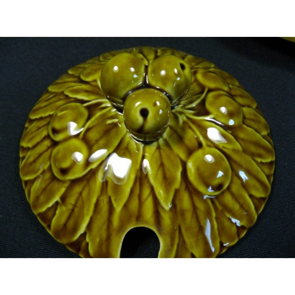 Pot à confiture en faïence barbotine estampillé Sarreguemines France, décor de fruits (cerises).