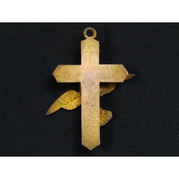 Crucifix porte-rameau en cuivre, orné d'un oiseau de la paix, un petit cylindre pour le rameau caché entre l'oiseau et la croix, un anneau pour le fixer au mur.
