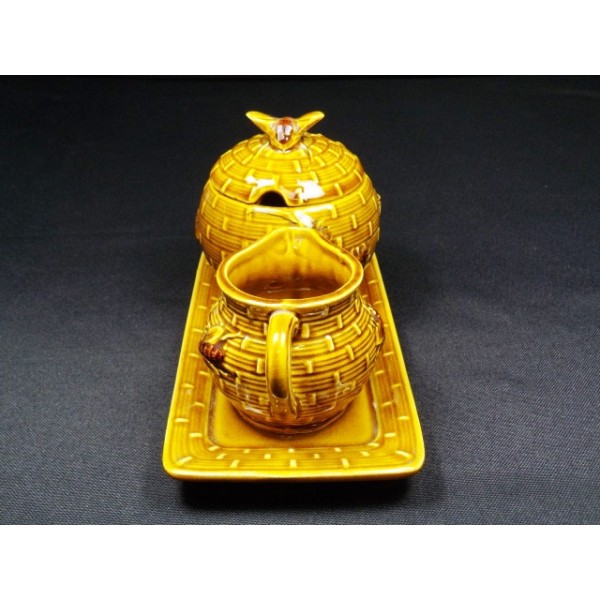 Service à miel en faïence barbotine composé d'un petit plateau rectangulaire, un petit pot verseur à bec et un pot à couvercle avec une encoche pour la cuillère et une prise en forme d'abeille.