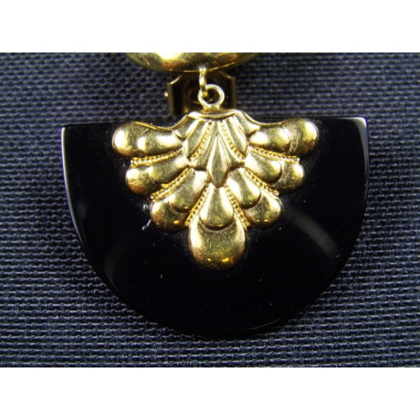 Très belle paire de boucles d'oreilles à clip de style art déco en métal doré et application de métal doré sur une plaque en verre opalin noir (ou d'onyx?) formant un demi-cercle.