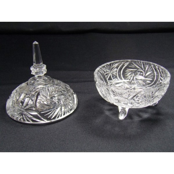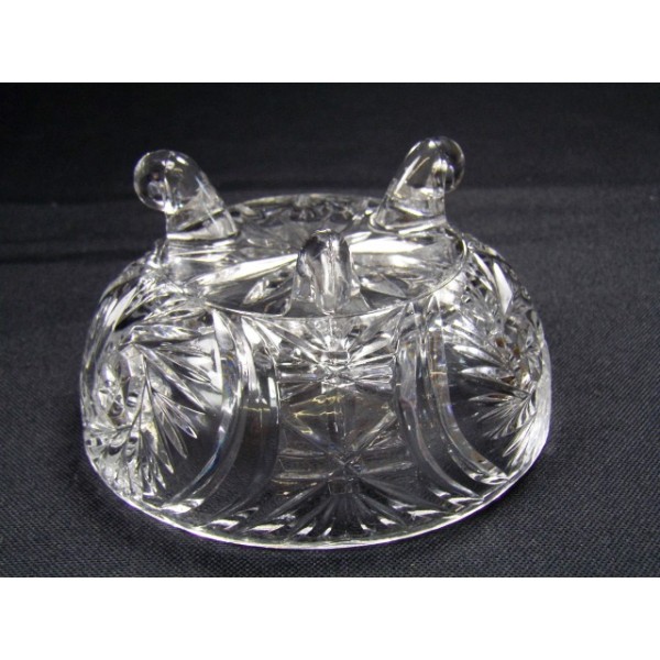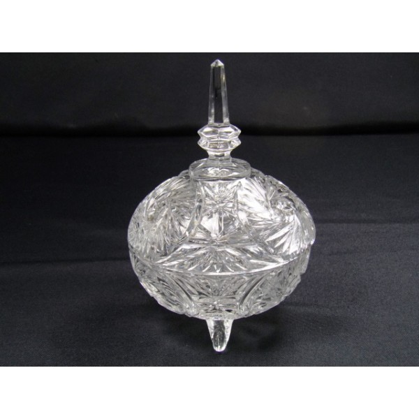 Sucrier ou bonbonnière en verre moulé (ou cristal moulé, à déterminer), décor classique dans le goût du cristal de Bohême, sur 3 petits pieds.