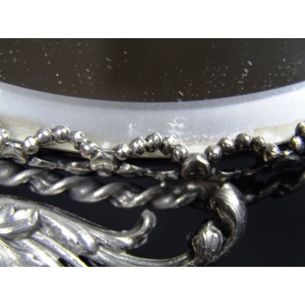 Miroir à main en métal argenté (ou argent ), double face dont une grossissante, très beau travail d'orfèvrerie.
