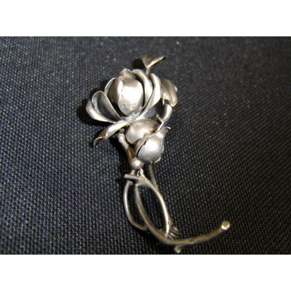 Broche en argent figurant une branche d'églantier fleurie, vers 1900, signée (C+un tableau rempli de lettres)