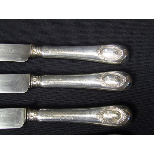 Série de 6 couteaux de table manche en argent fourré, lames acier gravées Paris, décor de médaillon chiffré (GL), de la maison Herbet et frères, vers 1900.