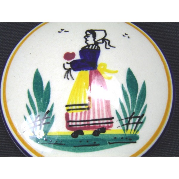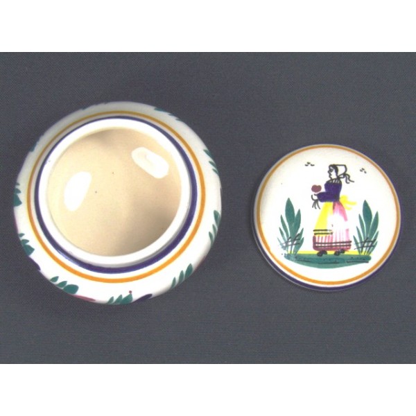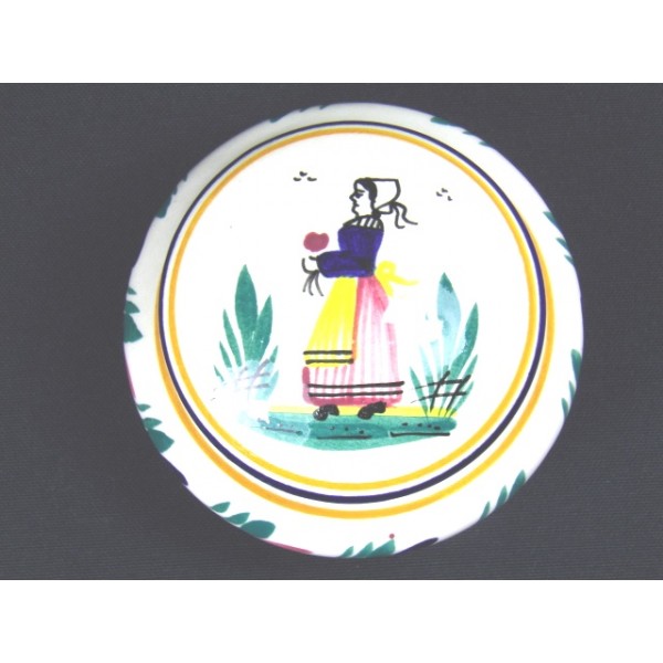 Boîte ronde en faïence signée HB Qimper, décor de paysanne peint à la main, noté dessous HB Quimper PE 300.