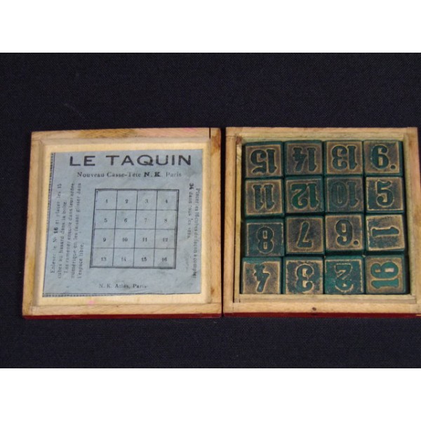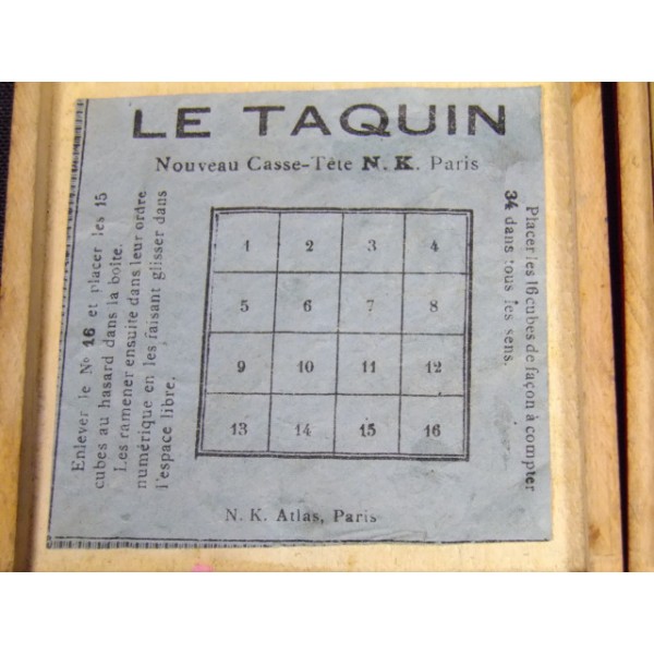 Petite boîte de jeu du Taquin, vers 1900, boîte et jetons en bois, règle du jeu collée dans le couvercle, nouveau casse-tête, édité par NK Atlas, Paris.
