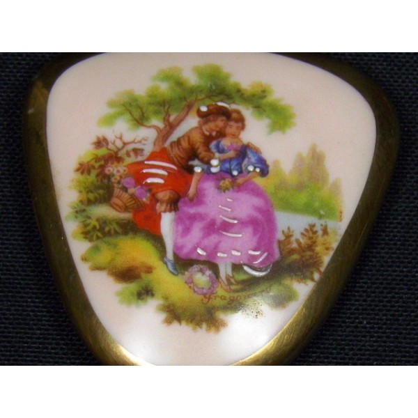 Petite boîte en porcelaine de Limoges, décor reproduction d'un tableau de Fragonard, réhaussé à l'émail blanc, tripode, signée JS Limoges.