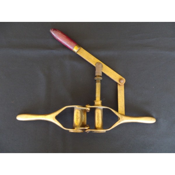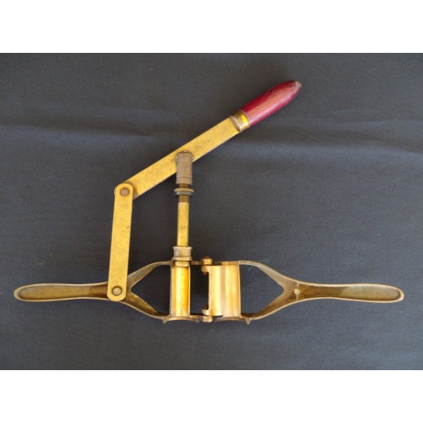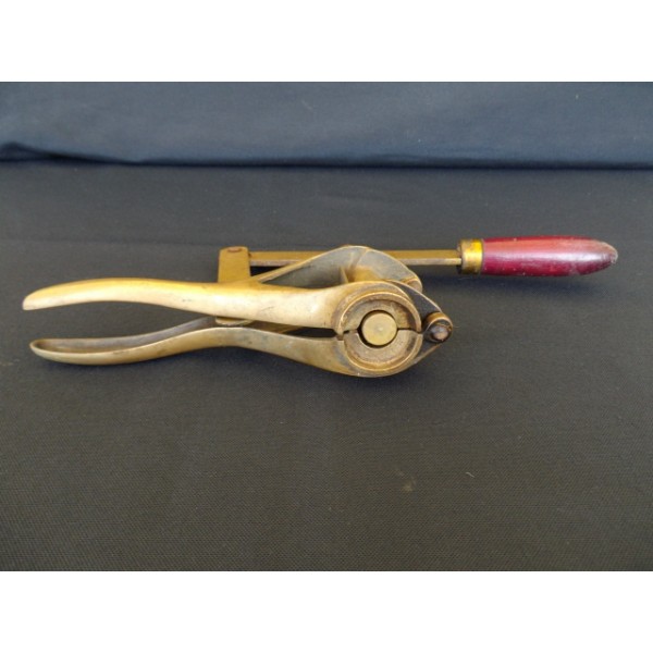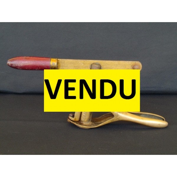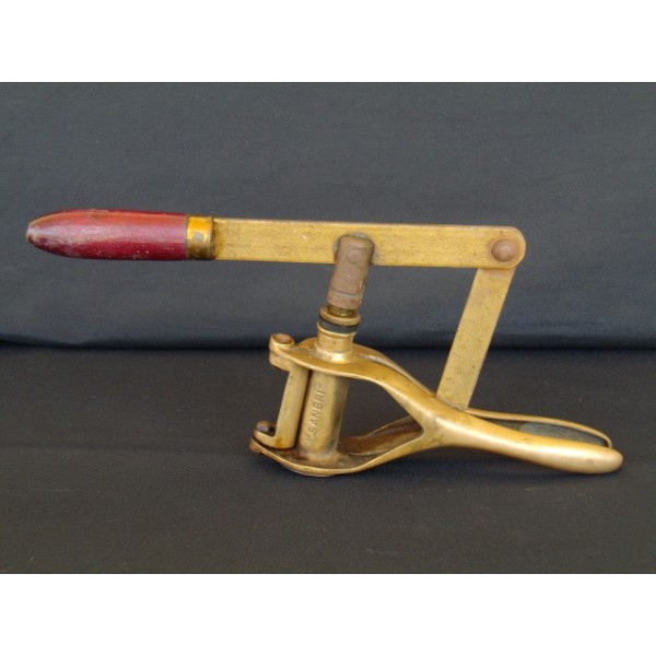 Bouchonneuse ancienne de marque Sanbri, milieu vingtième, cuivre ou laiton, manche en bois peint.