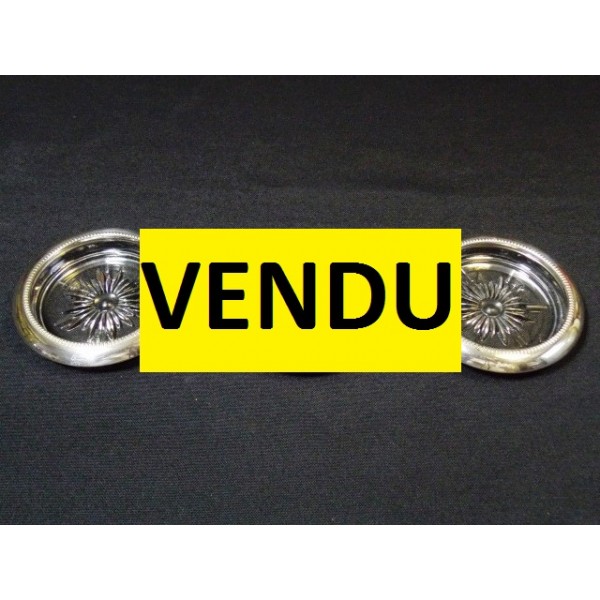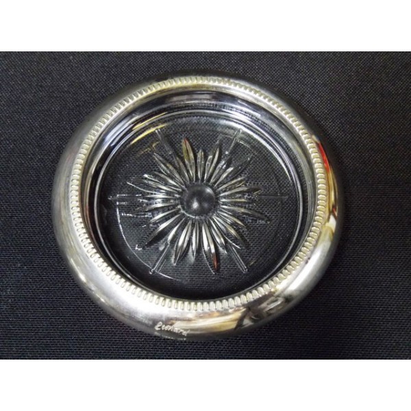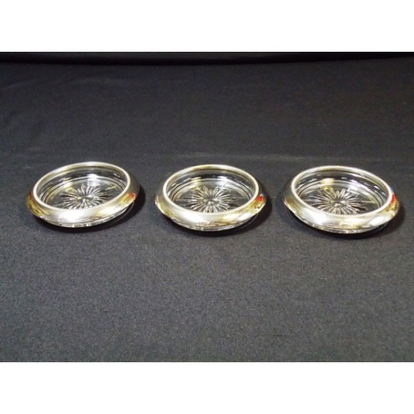 Ensemble de 3 dessous de bouteilles (ou de verres) en verre moulé et métal argenté, signés Léonard , fabriqués en Italie.