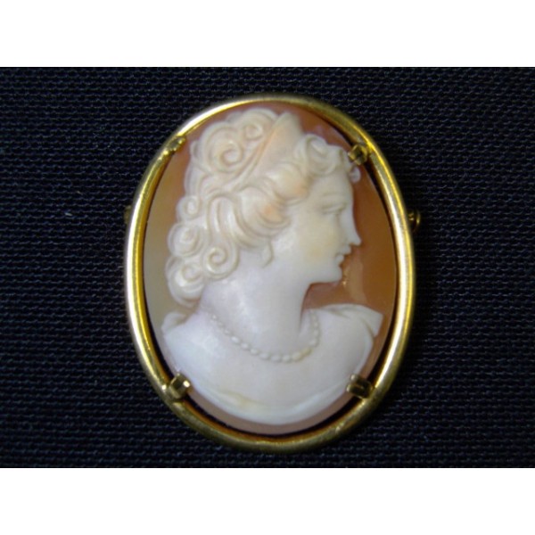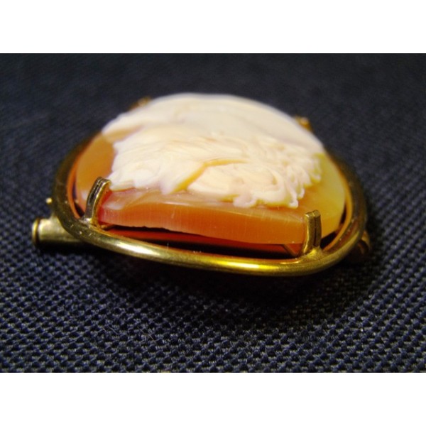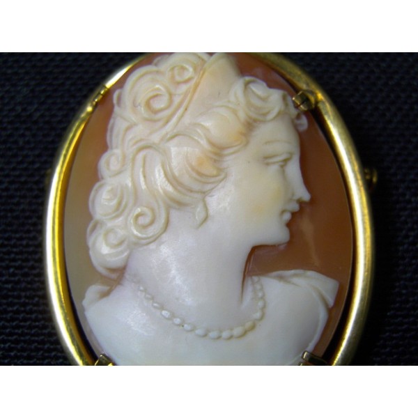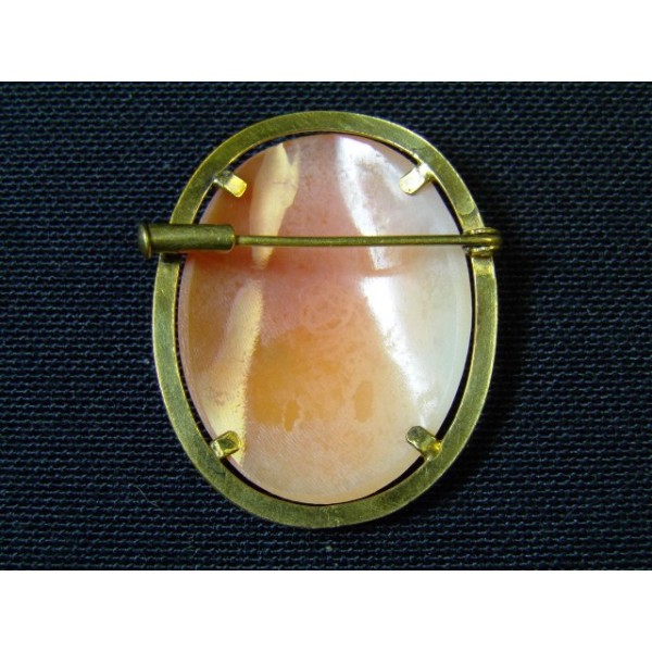 Très belle broche ancienne en métal doré (vermeil?), non poinçonnée, ornée d'un camée sur coquillage à profil féminin.