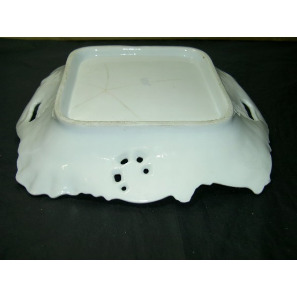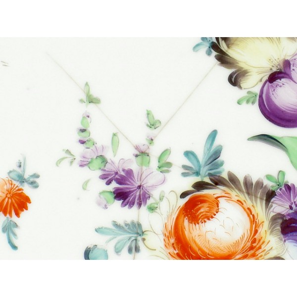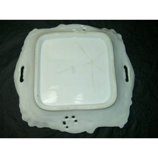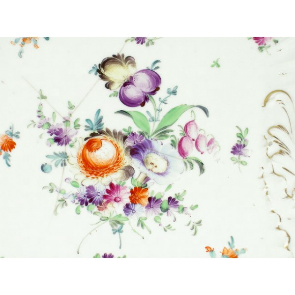 Plat carré en porcelaine ancienne début XIXème décor floral peint à la main, bords découpés, estampillé D surmonté d'une couronne.