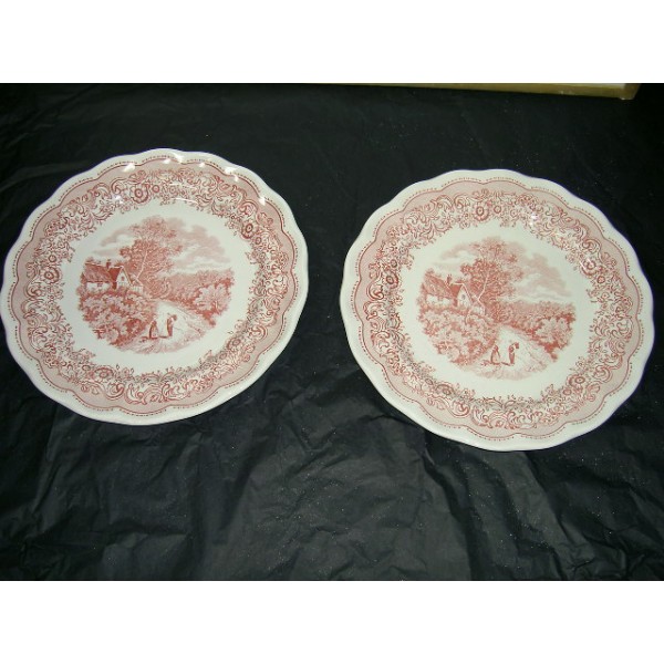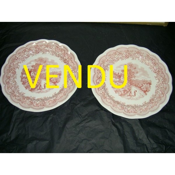 Très belle paire d'assiettes creuses en faïence de fabrication italienne, décor monochrome rouge, mécanique, de scène alpestre suisse.