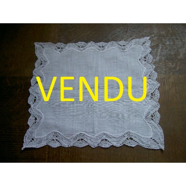 Petit napperon en coton fin bordé d'une broderie en coton faite au crochet. Travail ancien fait à la main. Objet en très bon état. Dimension : 19 cm x 21 cm