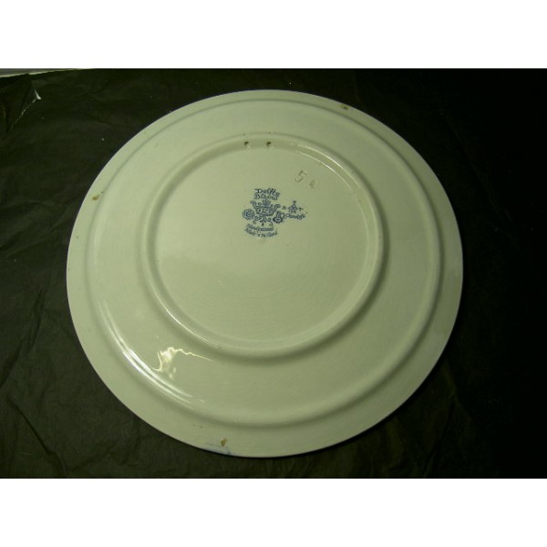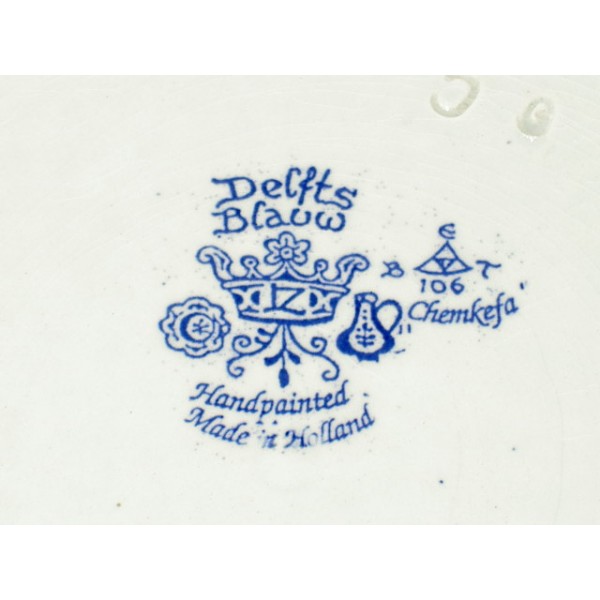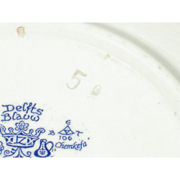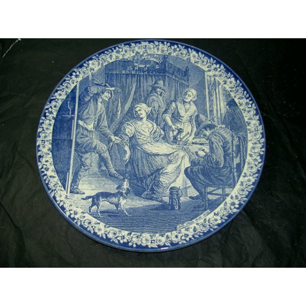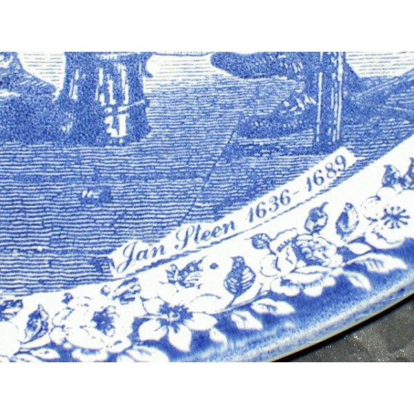 Plat en faïence de Delft, décor reproduction d'un tableau de Jan STEEN, faïencé dans la matière, tampons en photo.