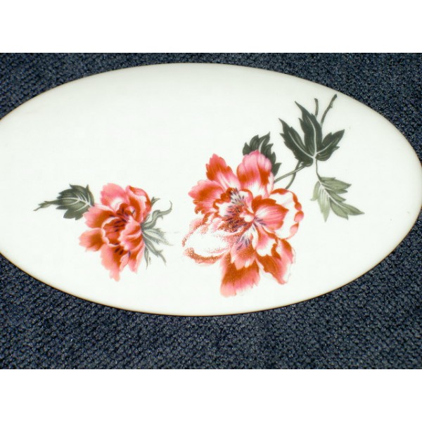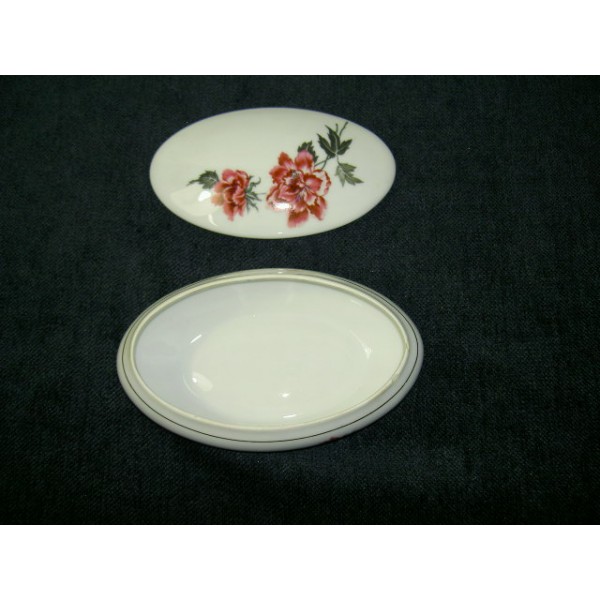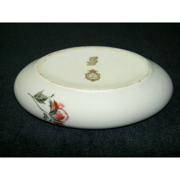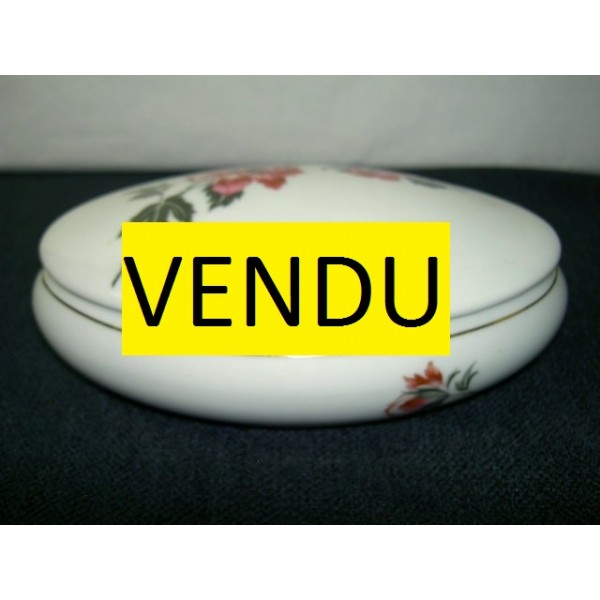 Boîte bonbonnière en porcelaine de Limoges estampillée FM, décor mécanique floral, forme ovale