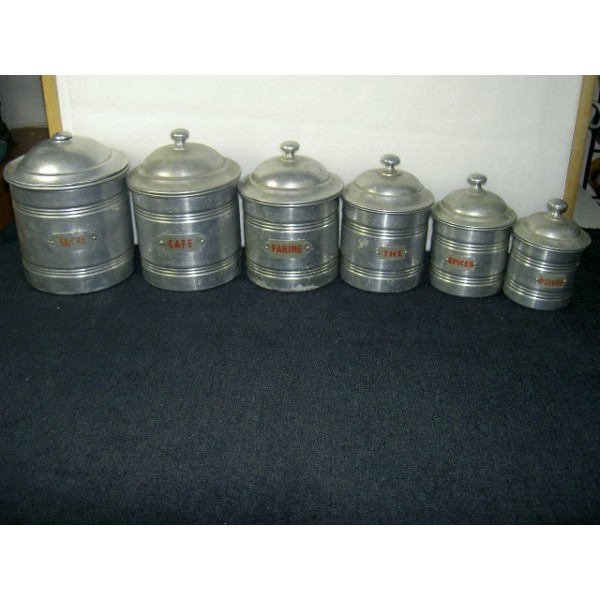 Série de 6 pots à épices gigognes en aluminium de marque La Ménagère Riom, étiquettes en façade, fabriquée en France