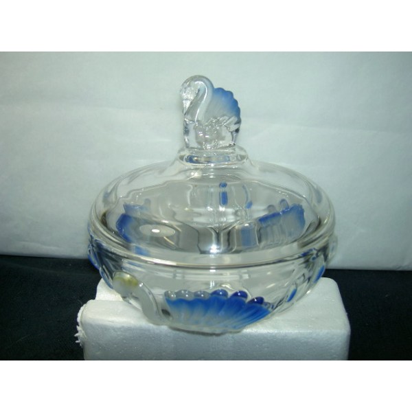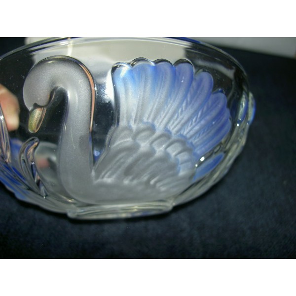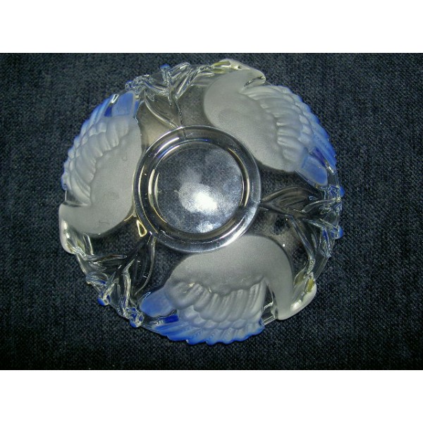 Drageoir en verre décor de cygnes en relief dépoli coloré bleu, prise en forme de cygne