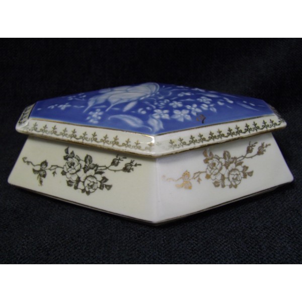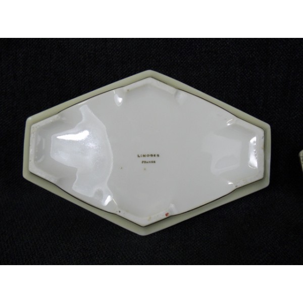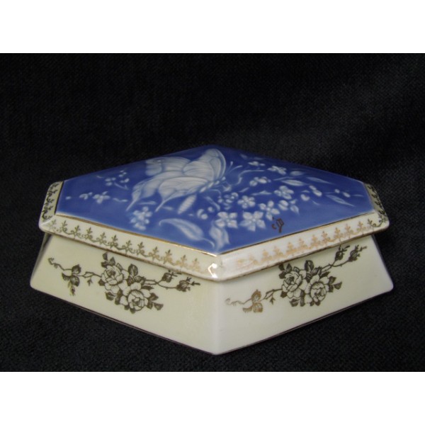 Boîte en porcelaine en forme de losange au couvercle décoré d'un papillon dans un décor floral signé Cid, la boîte est marquée limoges France .La base est ormée de motifs dorés