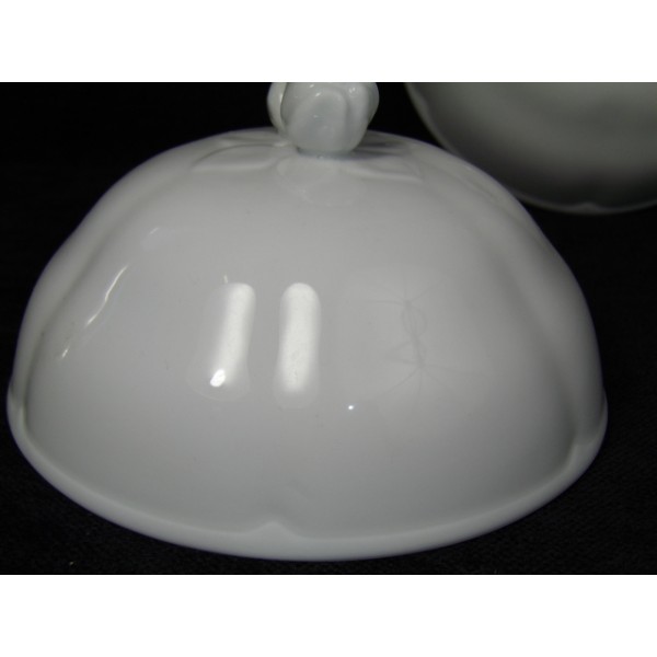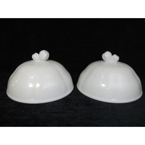 Ensemble de 2 cloches de service en porcelaine blanche, prises en forme de bouton de fleur.