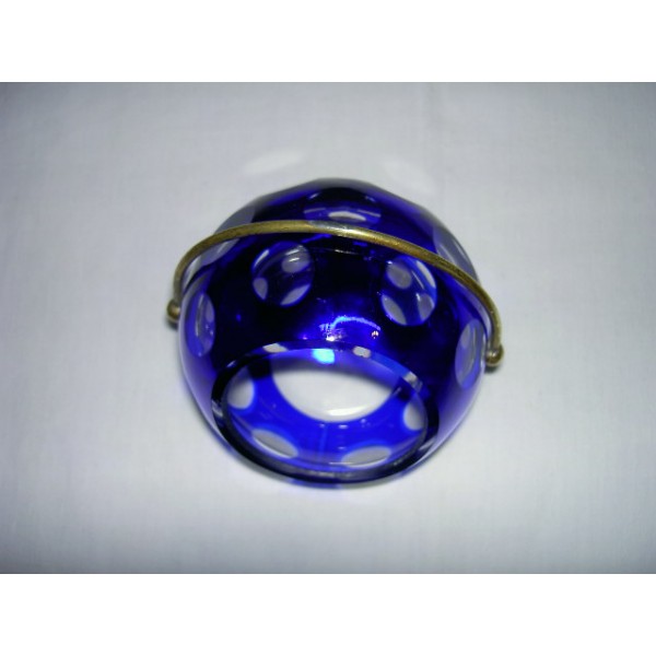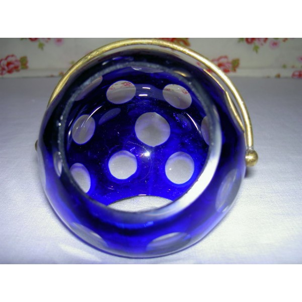 Joli petit sucrier en verre bleu ancien, en forme de dé de jeu avec des ronds en verre transparent. Anse en laiton. En très bon état. Diamètre 10 cm.