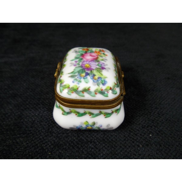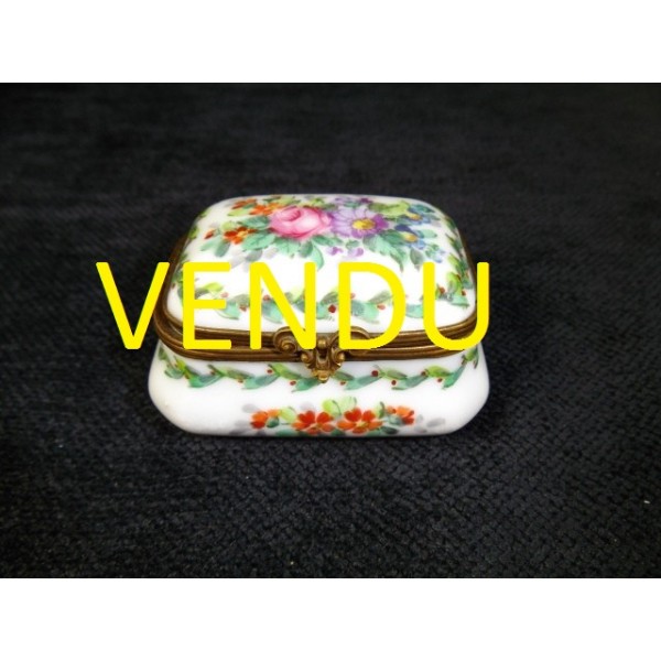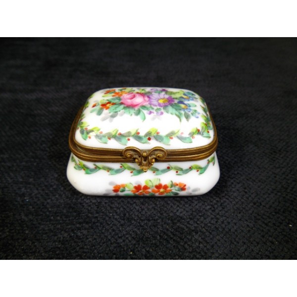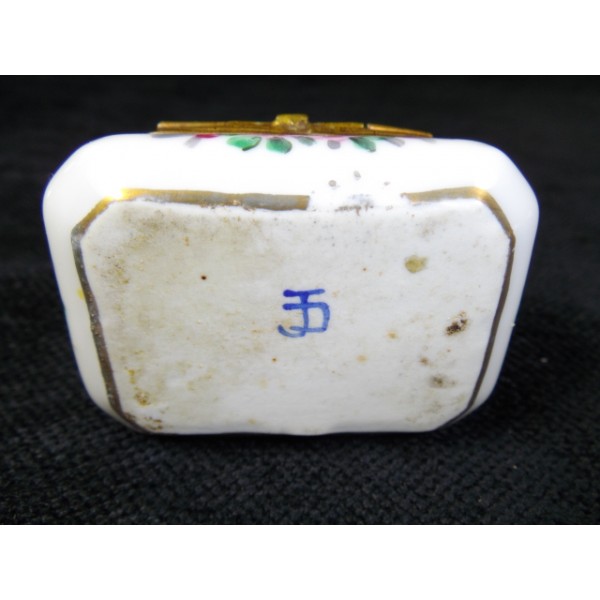 Petite boîte en porcelaine ancienne, décor floral peint à la main, système de fermeture en métal, signée des initiales HA sous le fond.