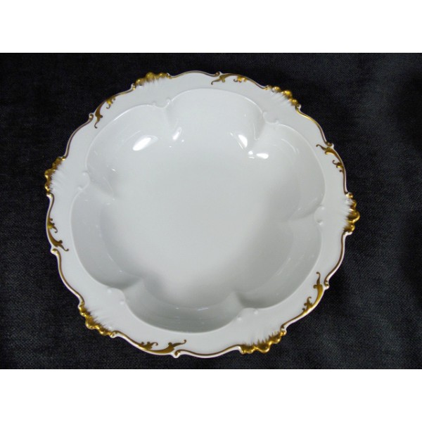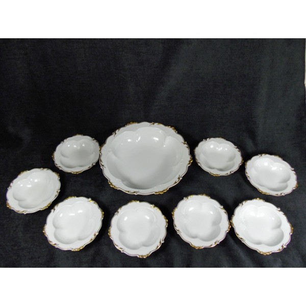 Service à crème en porcelaine de Limoges Jammet-Seignolles, composé d'un plat creux et de 8 coupelles, bord chantouré décor doré peint à la main.