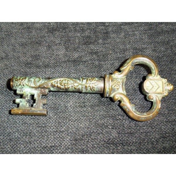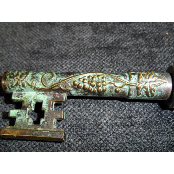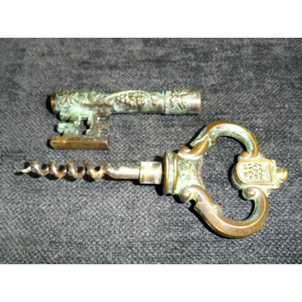 Clef tire-bouchon et décapsuleur en métal patiné imitant le bronze.