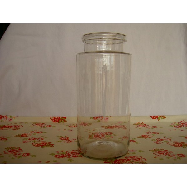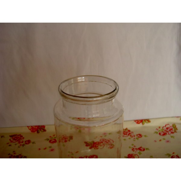 Pot à épicerie en verre. TBE. Hauteur 23 cm, diamètre 11 cm