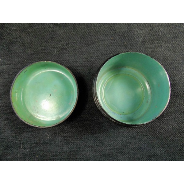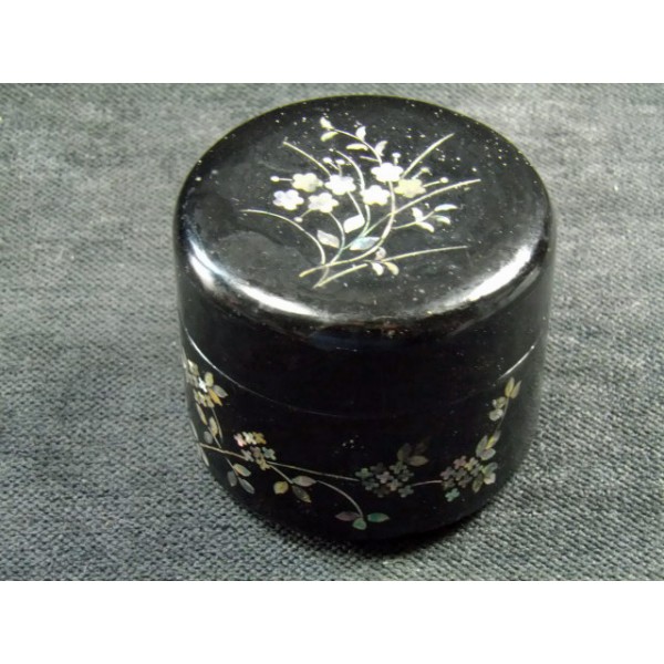 Bon état de conservation, on note un petit éclat de laque noire sur le rebord du couvercle (voir photo) et une petite fêlure sur le rebord du couvercle à peine perceptible.