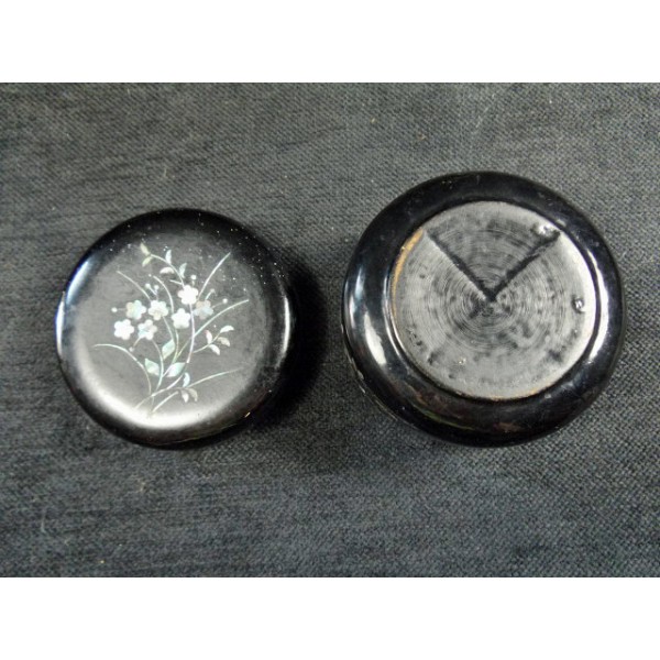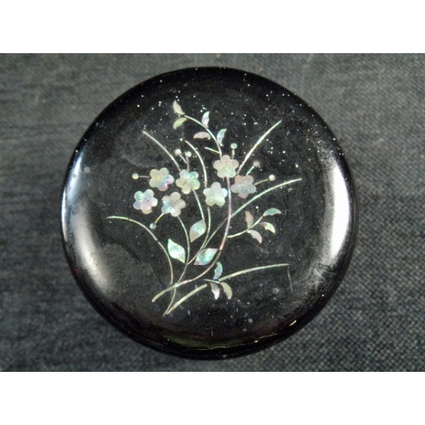 Boîte ronde en bois noirci d'époque Napoléon III à incrustations de nacre, intérieur peint en vert