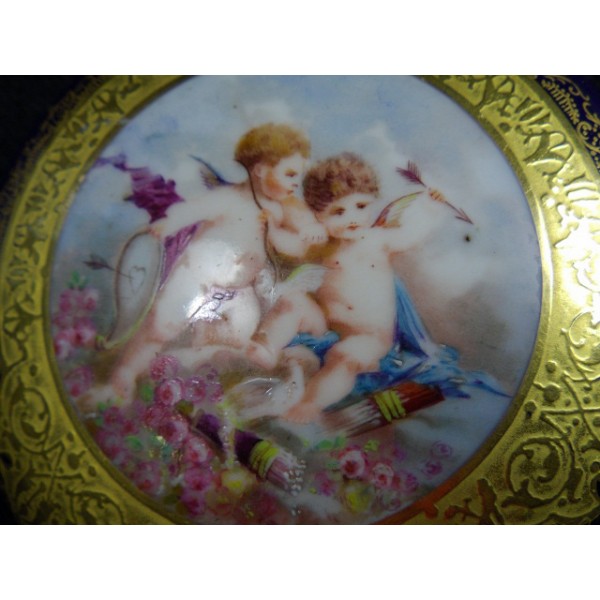 Boîte bonbonnière en porcelaine de Limoges "bleu de four", décor double incrustation d'or, médaillon orné d'Amours, réhaussé main, début Xxème, estampillé T & V France.